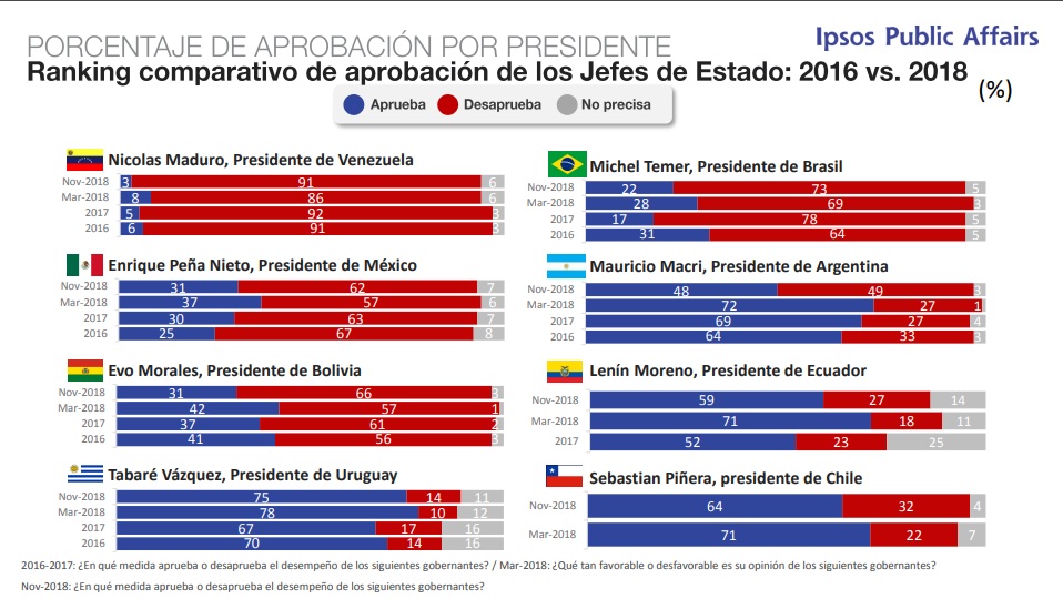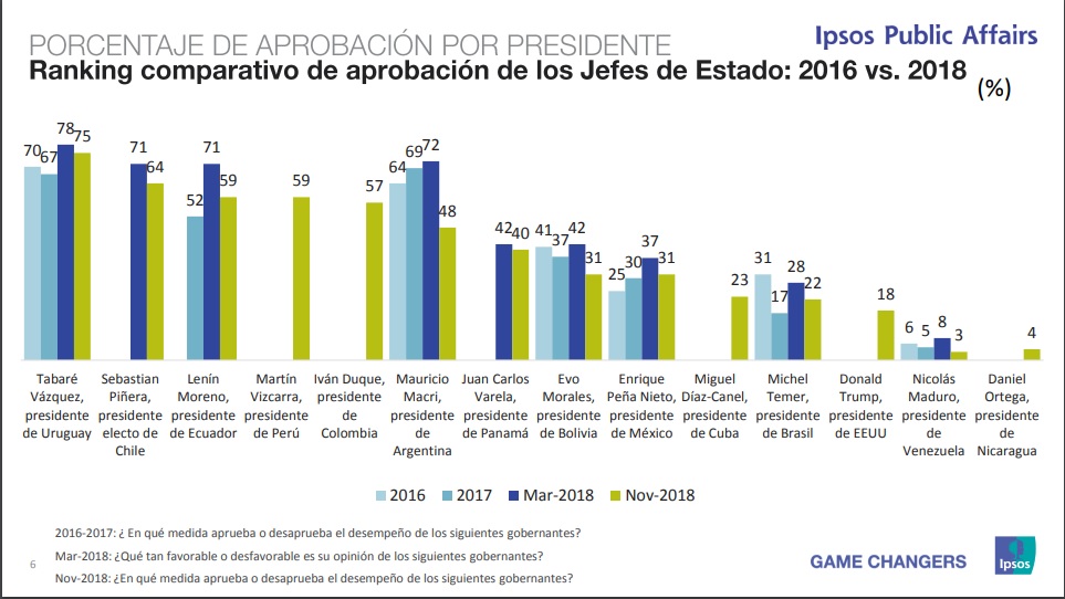 La diferencia más importante entre la primera medición, hecha en marzo, y la actual es la caída de la aprobación de Mauricio Macri de Argentina, lo cual podría tener su explicación en el complicado contexto económico del país.