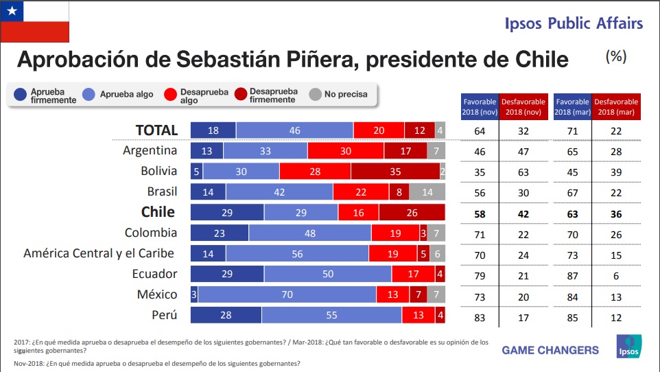 La encuesta Ipsos Public Affairs dio a conocer este miércoles el sondeo sobre aprobación presidencial, ubicando a Sebastián Piñera en el segundo lugar detrás de Tavaré Vásquez de Uruguay.