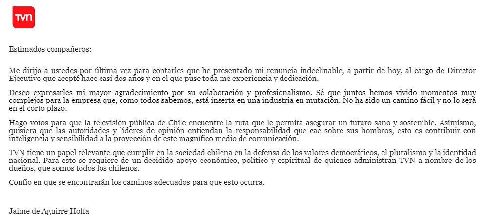 En medio de una crisis por la seguridad del canal y las pérdidas económicas rimbombantes que acarrea, el director Ejecutivo de Televisión Nacional de Chile, Jaime de Aguirre, dejó el canal público.
