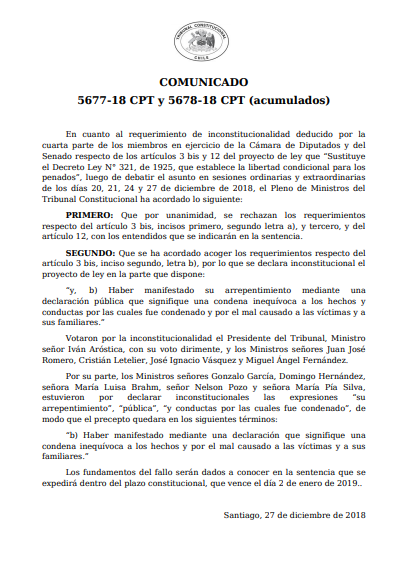 De esta forma, el TC decidió acoger la petición de declarar inconstitucional exigir el arrepentimiento a los condenados por violaciones a los DD.HH., pero mantiene los requerimientos de 2/3 de la pena cumplida y cooperar eficazmente en la investigación de los delitos.