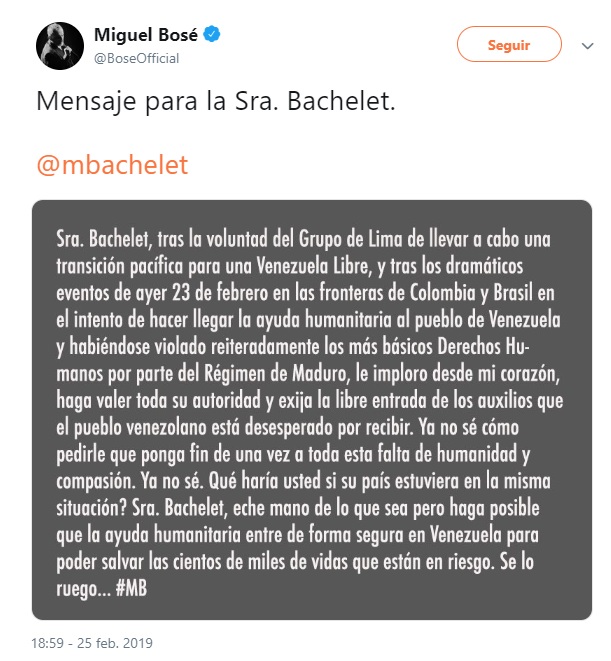Miguel Bosé, que lanzó duros mensajes a la Alta Comisionada por los DDHH de la ONU, la ex presidenta Michelle Bachelet, el pasado sábado, nuevamente volvió a cargar contra ella, pero esta vez en un tono más amable pero dramático: “Sra Bachelet, tras la voluntad del Grupo de Lima de llevar a cabo una transición pacífica para una Venezuela Libre, y tras los dramáticos eventos de ayer 23 de febrero en las fronteras de Colombia y Brasil en el intento de hacer llegar la ayuda humanitaria al pueblo de Venezuela y habiéndose violado reiteradamente los más básicos Derechos Humanos por parte del Régimen de Maduro le imploro desde mi corazón, haga valer toda su autoridad y exija la libre entrada de los auxilio que el pueblo venezolano está desesperado por recibir. Ya no sé cómo pedirle que ponga fin de una vez a toda esta falta de humanidad y compasión. Ya no sé. Qué haría usted si su país estuviera en la misma situación? Sra. Bachelet, eche mano de lo que sea pero haga lo posible que la ayuda humanitaria entre de forma segura en Venezuela para poder salvar las cientos de miles de vidas que están en riesgo. Se lo ruego…#MB”.
