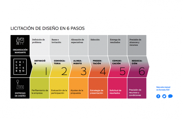 En este proceso, Chile Diseño contó con el trabajo de la consultora Petit (empresa asociada) y su director Rodrigo González, quien donó su trabajo en consultoría para que -a través de metodologías del diseño, design thinking y el diseño de servicios- se identificaran los problemas más habituales, estableciendo los 6 puntos clave dentro de una licitación. Además, participaron oficinas asociadas y sus clientes, armando un ecosistema representativo de la industria del diseño.