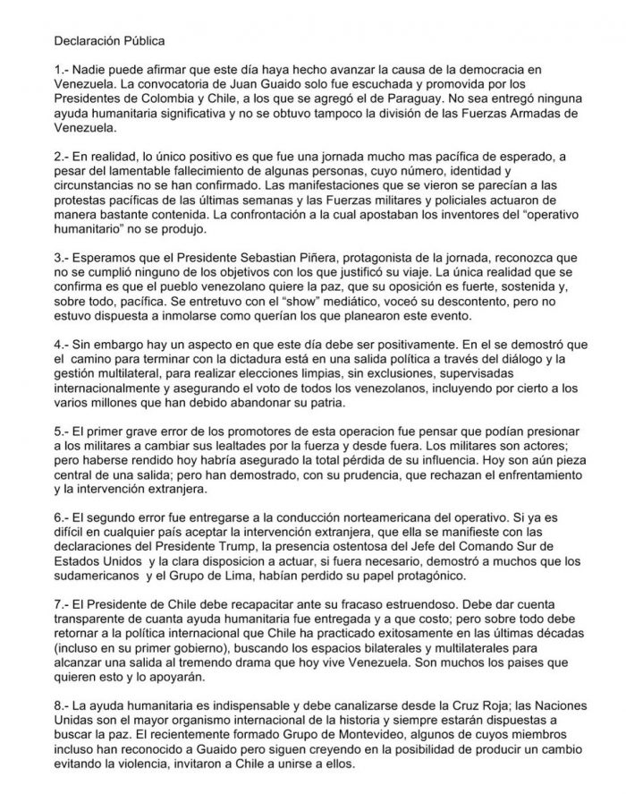 “El Presidente de Chile debe recapacitar ante su fracaso estruendoso. Debe dar cuenta transparente de cuánta ayuda humanitaria fue entregada y a que costo; pero sobre todo debe retornar a la política internacional que Chile ha practicado exitosamente en las últimas décadas (incluso en su primer gobierno), buscando los espacios bilaterales y multilaterales para alcanzar una salida al tremendo drama que hoy vive Venezuela. Son muchos los países que quieren esto y lo apoyarán”, dice el comunicado firmado entre otros los senadores PS José Miguel Insulza (excanciller), Isabel Allende y Juan Pablo Letelier; el excanciller Mariano Fernández y el exministro Carlos Ominami. Además, Ana Lya Uriarte, exjefa de gabinte de Michelle Bachelet; Pedro Felipe Ramírez y Osvaldo Rosales. Asimismo, los DC Gonzalo Arenas (exembajador en la UE) y Ricardo Herrera (exembajador en Cuba).