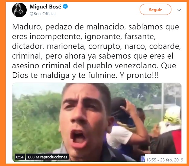 El cantante también maldijo al jerarca venezolano Nicolás Maduro a quien dedicó un fulminante mensaje en Twitter: «Maduro, pedazo de malnacido, sabíamos que eres incompetente, ignorante, farsante, dictador, marioneta, corrupto, narco, cobarde, criminal, pero ahora ya sabemos que eres el asesino criminal del pueblo venezolano. Que Dios te maldiga y te fulmine. Y pronto!!!».