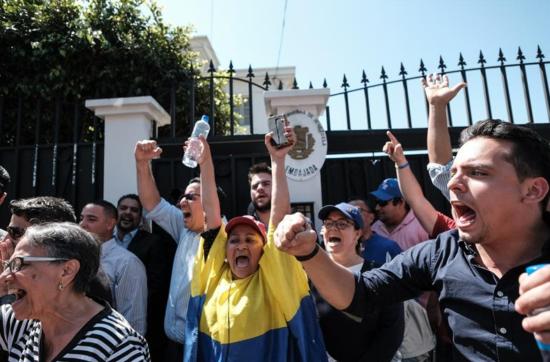 El domingo, dos grupos de venezolanos apoyados por chilenos se apostaron fuera de la legación diplomática venezolana en rechazo y apoyo al régimen de Maduro. Sin embargo, los opositores al Gobierno de Caracas profirió consignas, cánticos e insultos en contra de comunistas que abogaban por la defensa del mandatario venezolano.