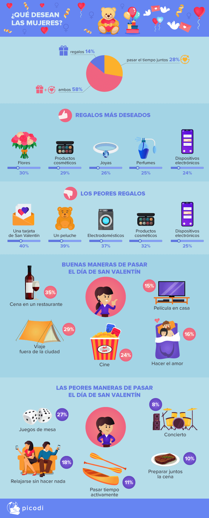 Entre las categorías de regalos más deseados las mujeres destacaron las siguientes: flores (30%), productos cosméticos (29%), joyas (26%), perfumes (25%) y dispositivos electrónicos (24%). En cuanto a los regalos menos deseados, los datos de la encuesta confirman que una tarjeta de San Valentín (40%), peluches (39%), electrodomésticos (37%), productos cosméticos (32%) y dispositivos electrónicos (25%) no son una buena idea..