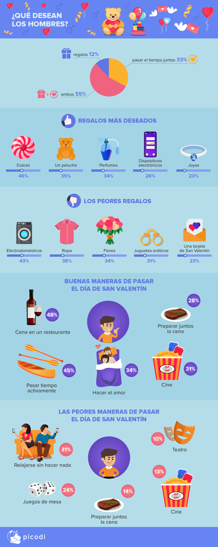 Los hombres son un grupo más indeciso que las mujeres. La mayoría de ellos (55%) esperan recibir tanto regalos materiales como no materiales. Además, el 12% se conforma con un obsequio y el 33% quiere pasar este día con su pareja.
