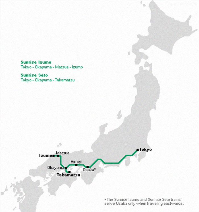 Los únicos trenes nocturnos regulares que quedan en el país son el Sunrise Seto y el Sunrise Izumo. Ambos van juntos desde Tokyo a Okayama como un solo tren de 14 vagones.En la estación de Okayama se separan en dos, teniendo ambos 7 vagones, y separan sus caminos. Sunrise Seto va hasta Takamatsu en la isla de Shikoku, y Sunrise Izumo va hasta Izumo, en la prefectura de Shimane.En el viaje de vuelta, ambos trenes vuelven a encontrarse en Okayama y vuelven juntos hasta el final del trayecto en Tokyo.
