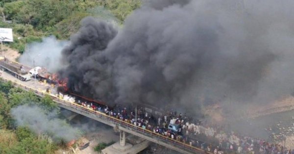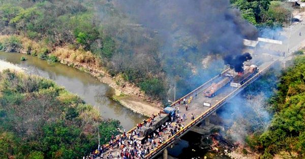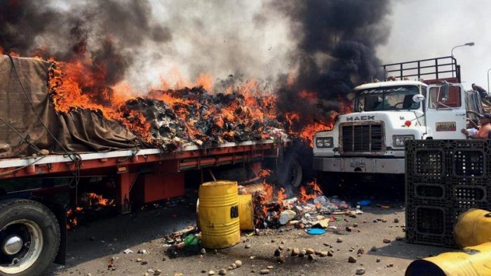 Migración Colombia confirmó poco después la quema de los dos camiones. Imágenes de video que circularon en las redes sociales y en canales de internet muestran a decenas de personas sacando de los camiones bolsas y cajas con medicinas y alimentos, en medio de una gran nube de humo. «Nuestros valientes voluntarios están realizando una cadena para salvaguardar la comida y las medicinas. La avalancha humanitaria es indetenible», aseguró Juan Guaidó, reconocido por 50 países como presidente interino de Venezuela.