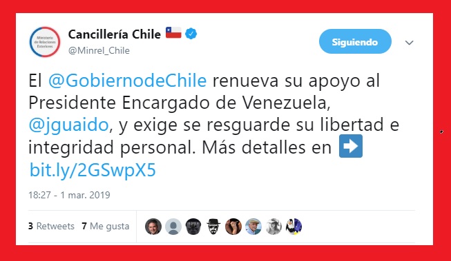 Otra vez, la Cancillería que capitanea Roberto Ampuero, reitera apoyo al hoy debilitado presidente encargado y autoproclamado Juan Guadió, que por estos días ha recorrido Brasil y Paraguay buscando apoyo, por lo que la Cancillería rápidamente vía Twitter salió a respaldar nuevamente.