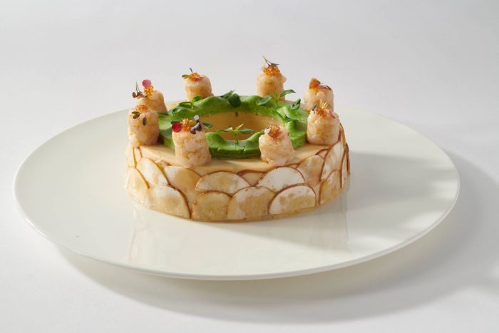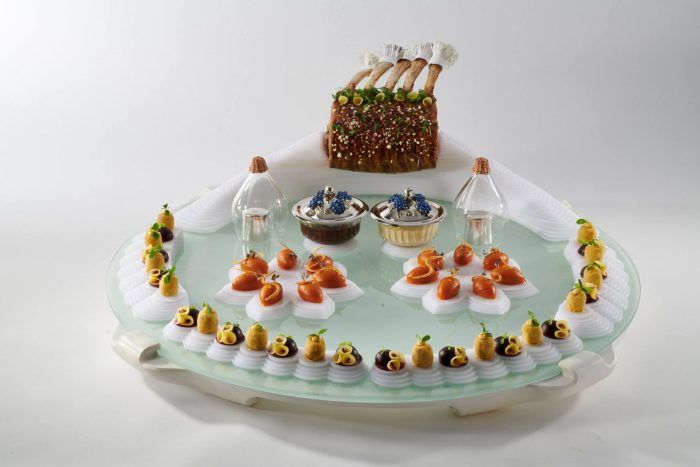 Chartreuse de coliflor y pastis, relleno de espinacas y crema cuajada de verduras, choritos y almejas con pan de especias. Tartar de ostiones y semillasde cilantro.