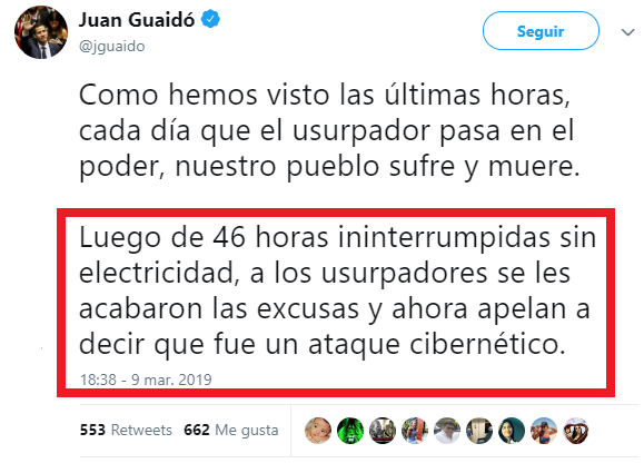 Por su parte el autoproclamado presidente encargado, Juan Gauidó escribió en Twitter: «Luego de 46 horas ininterrumpidas sin electricidad, a los usurpadores se les acabaron las excusas y ahora apelan a decir que fue un ataque cibernético».