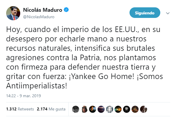 Por su parte, el presidente de Venezuela, Nicolás Maduro, volvió a acusar a Estados Unidos del corte de energía. «El imperio de los EE.UU., una vez más, subestima la conciencia y determinación del pueblo venezolano. Les aseguro, que cada intento de agresión imperial se encontrará con una respuesta contundente de las y los patriotas que amamos y defendemos, con valentía, nuestra Patria”, escribió el mandatario en su cuenta de Twitter.
