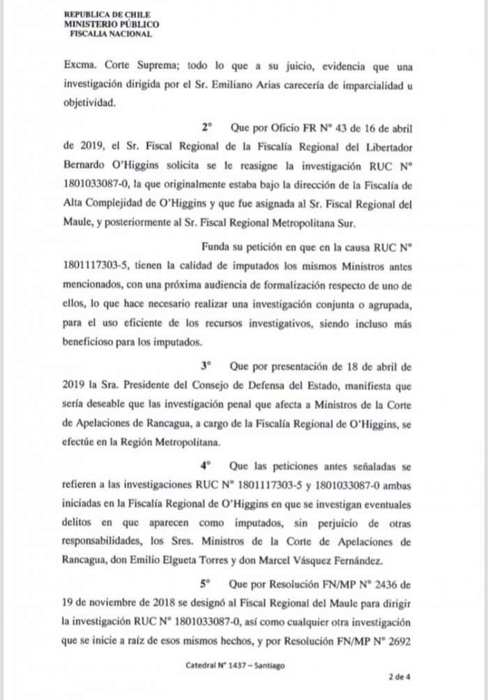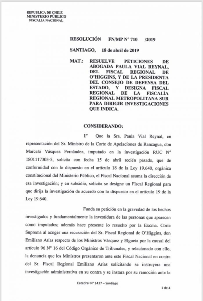 En su resolución, Abbott sostiene que ha habido un evidente conflicto jurídico, expresado en “solicitudes de inhabilitación o de sanción disciplinaria, entre los Ministros de la Corte de Apelaciones, imputados en estas investigaciones, y el Fiscal Regional de O’Higgins, manifestado en la solicitud de los primeros de que se aplique al Fiscal Regional la sanción disciplinaria de mayor gravedad y se pida su remoción ante la Corte Suprema, y en la solicitud de recusación contra los mismos ministros presentada por el Fiscal Regional en noviembre de 2018; todo lo que obliga, a fin de evitar cuestionamientos sobre la objetividad de la investigación, a disponer que las investigaciones sea dirigidas por otro Fiscal Regional”.