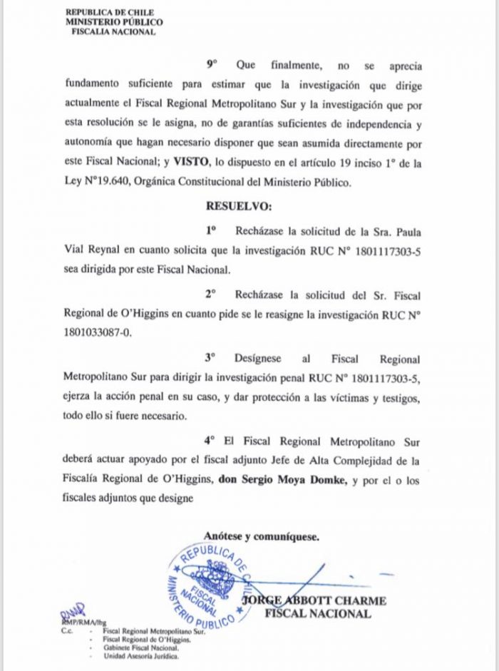 En la parte final del documento, Abbott hace hincapié en que el fiscal Sergio Moya, “quien ha estado a cargo de dicha investigación desde su inicio”, apoyará al Fiscal Regional Metropolitano Sur, “concentrándose de este modo la dirección de ambas investigaciones en un Fiscal Regional”.