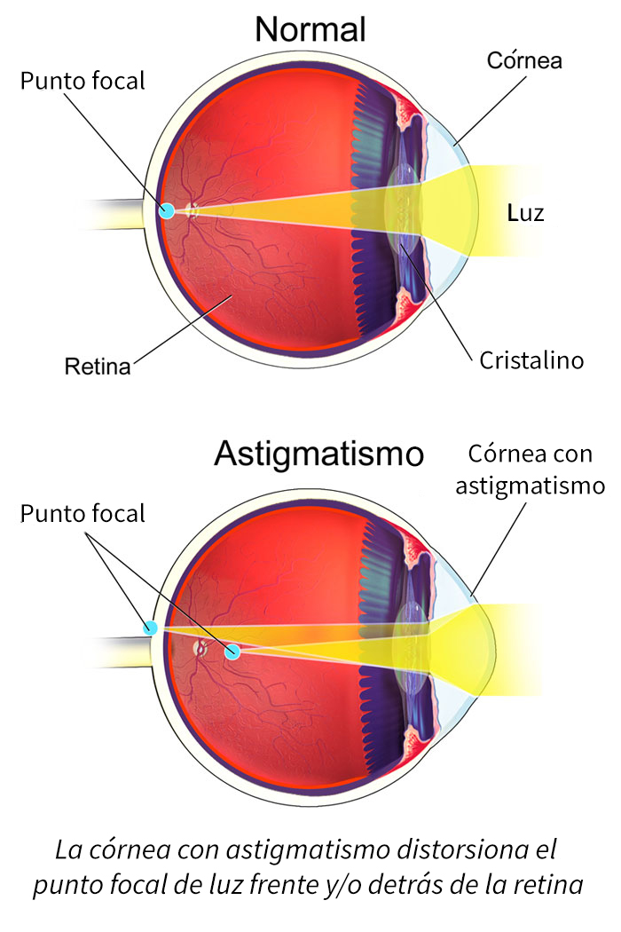 El astigmatismo es un problema refractivo que ocurre cuando la córnea (la membrana anterior del ojo) o el cristalino tienen curvas que no encajan. Un ojo normal tiene la córnea y el cristalino curvados de forma redonda, mientras que la gente con astigmatismo tiene uno de estos elementos en forma de huevo. En un ojo perfecto, la forma redonda refleja la luz entrante para producir una imagen bien enfocada en la retina.