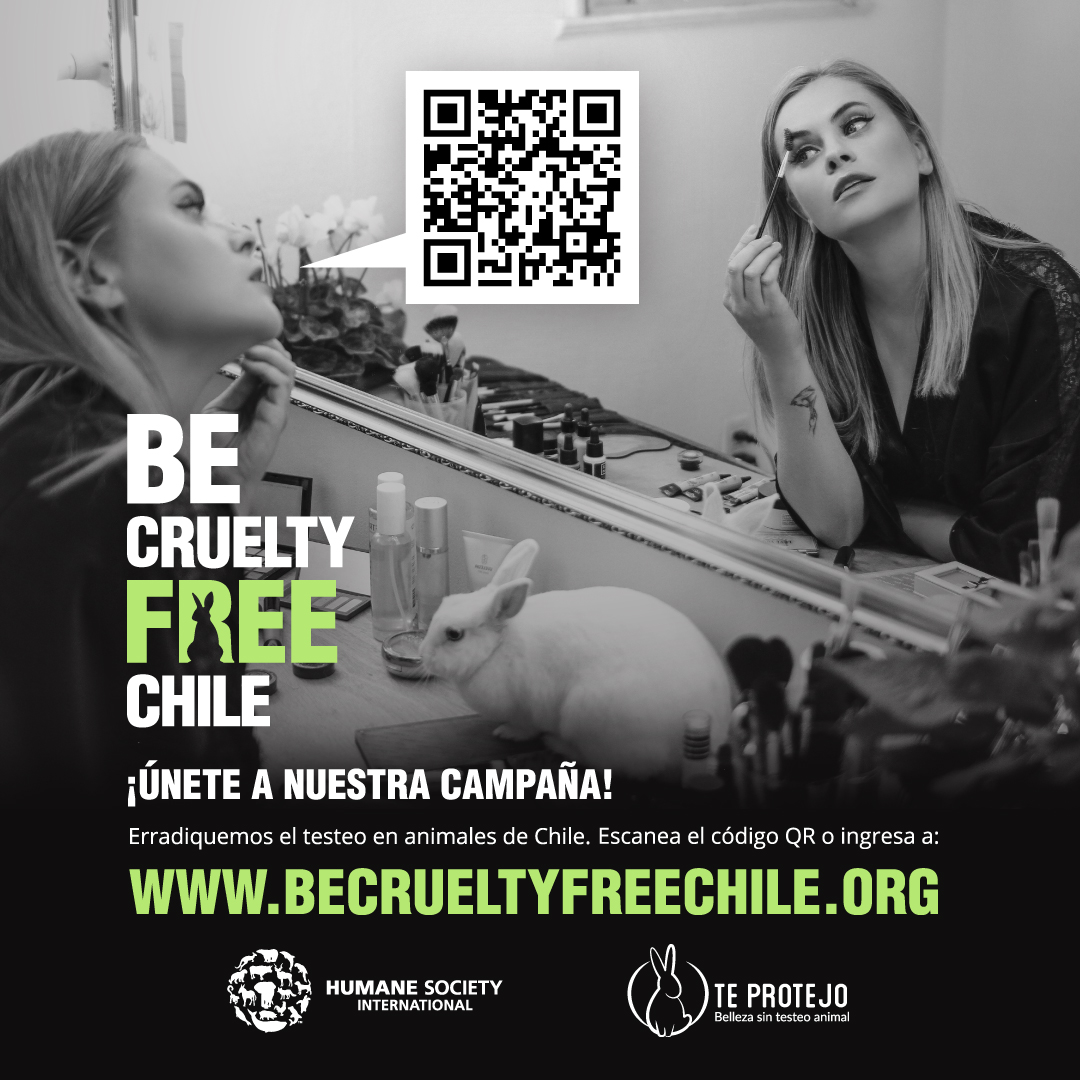 #BeCrueltyFree es una campaña de carácter internacional coordinada por Humane Society International, que busca prohibir el testeo en animales para cosmética en todo el mundo. Hasta hoy se ha logrado aprobar proyectos de Ley en 39 países, entre ellos el mayor logro es la prohibición en la Unión Europea. En la actualidad #BeCrueltyFree está trabajando en ocho campañas paralelas, incluida la de Chile.