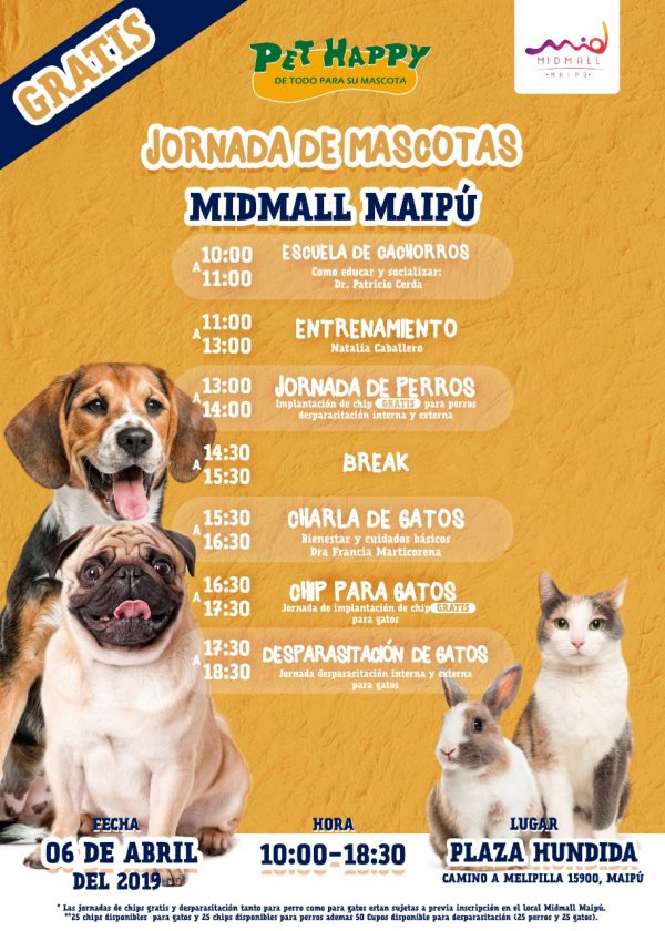 Midmall Outlet Maipú junto a Pet Happy continúa su compromiso y apoyo hacia las mascotas y el cuidado responsable. Por esta razón, el próximo sábado 6 de abril abrirán nuevamente un espacio en Plaza Hundida (Camino Melipilla 15900, Maipú) para realizar la “JORNADA DE MASCOTAS”, para todos aquellos que quieran aprender más sobre el bienestar y cuidado de sus animales.