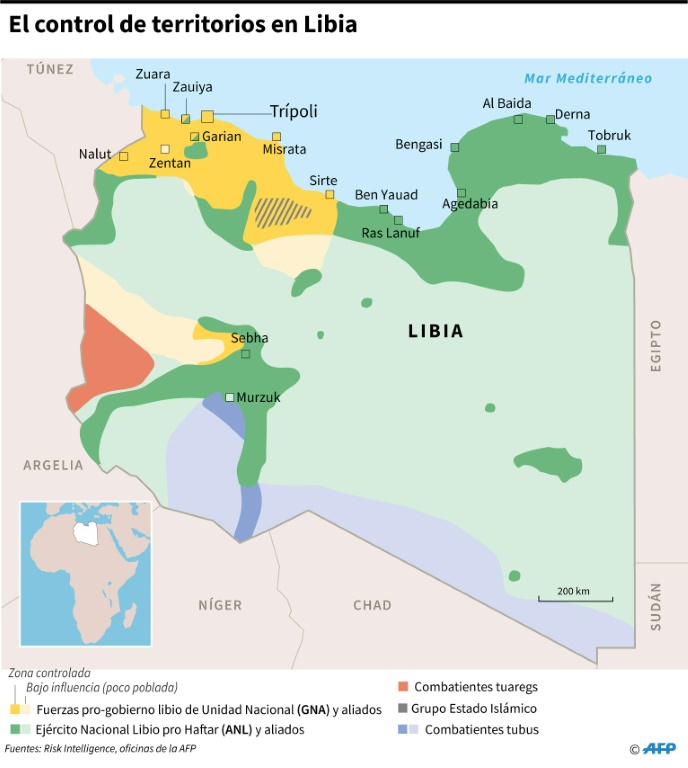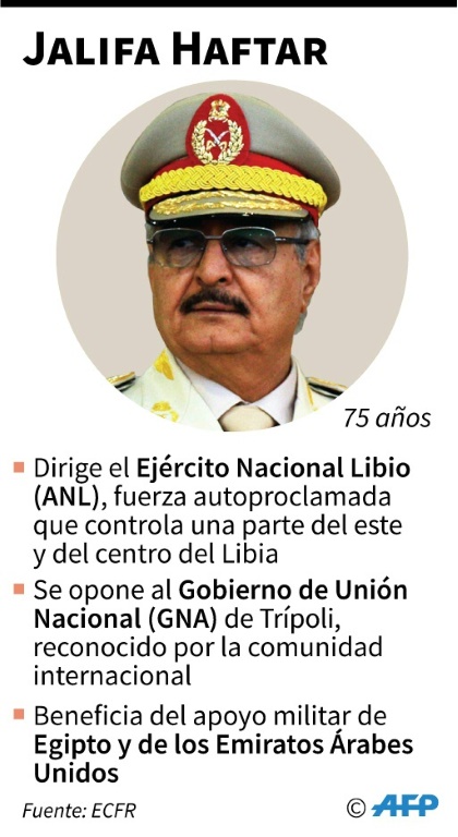 Las fuerzas de Jalifa Haftar son leales a una autoridad basada en el este del país que se opone al Gobierno de Unidad Nacional (GNA), instalado en Trípoli (oeste) y reconocido por la comunidad internacional.