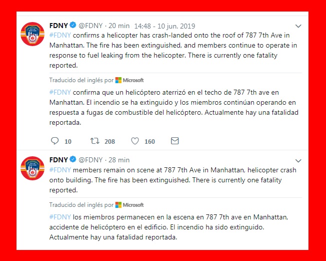 Los bomberos informaron por Twitter que al parecer el helicóptero se impactó en la parte superior de la torre, la cual está cerca del Rockefeller Center y Times Square.
