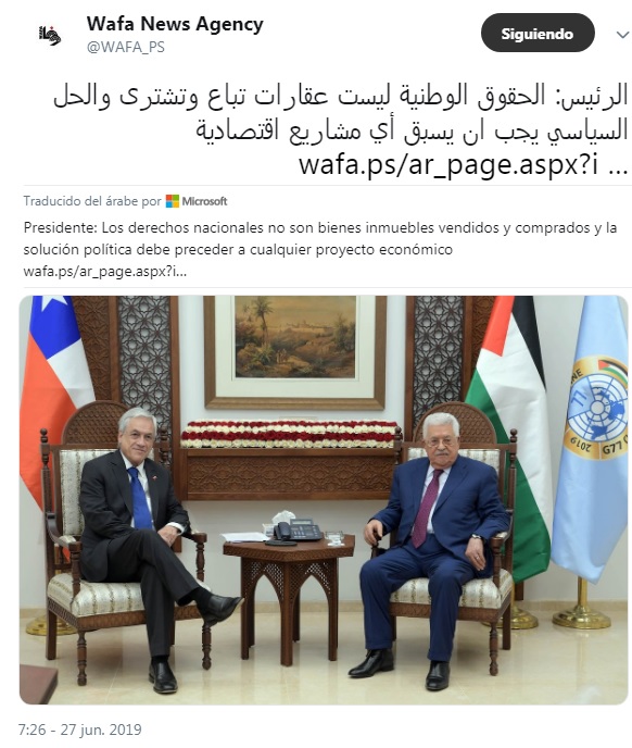 Piñera destacó la creación de un código arancelario en Chile que permitirá impulsar el comercio con Palestina. Además, hizo un llamado a la paz en la región y reiteró que Chile está a favor de la existencia de dos estados libres, soberanos e independientes con fronteras reconocidas y seguras.