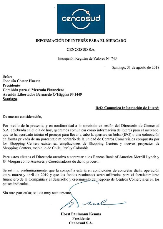 El uso principal de los fondos recaudados está destinado a pagar deudas que actualmente tiene la firma con su matriz Cencosud, informa y advierte la agencia Reuters.