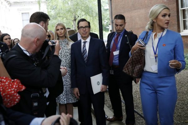 El secretario del Tesoro de EEUU Steve Mnuchin, la asesora presidencial Ivanka Trump y otros funcionarios del gobierno estadounidense en visita oficial en Londres, el 4 de junio del 2019. (AP Photo/Alex Brandon)