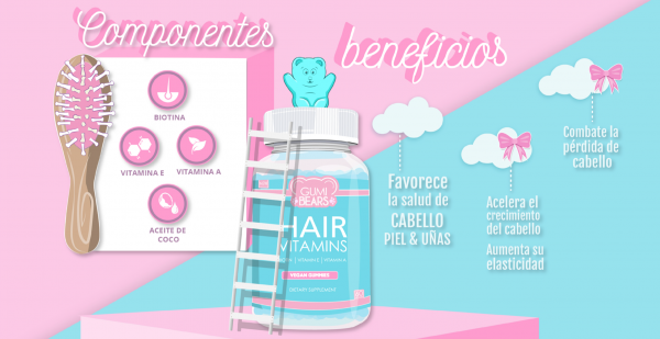 – Gumi Bears Hair contiene: biotina, vitamina A y E, que son las principales vitaminas que necesita tu cabello.