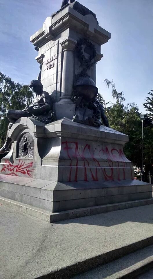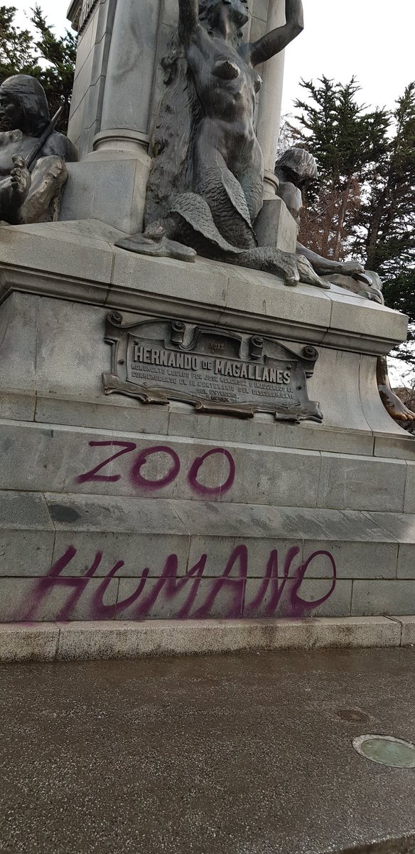 «#PuntaArenas Indignate!. Así amaneció monumento H de Magallanes en plaza Muñoz Gamero.Vándalos nuevamente atentan contra la ciudad y nuestro http://patrimonio.Se limpiará durante la jornada y estamos revisando cámaras.Una verguenza!», escribía a las 09:51 de esta mañana -con justa molestia- el alcalde de la ciudad austral Claudio Radonich.