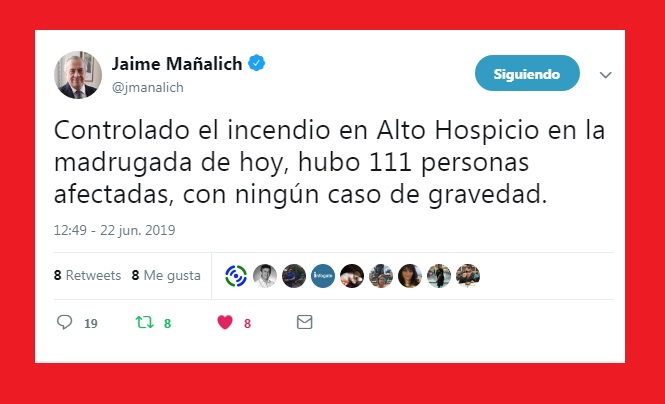 Por su parte elMinistro de Salud, Jaime Mañalich tuiteó: «Controlado el incendio en Alto Hospicio en la madrugada de hoy, hubo 111 personas afectadas, con ningún caso de gravedad».