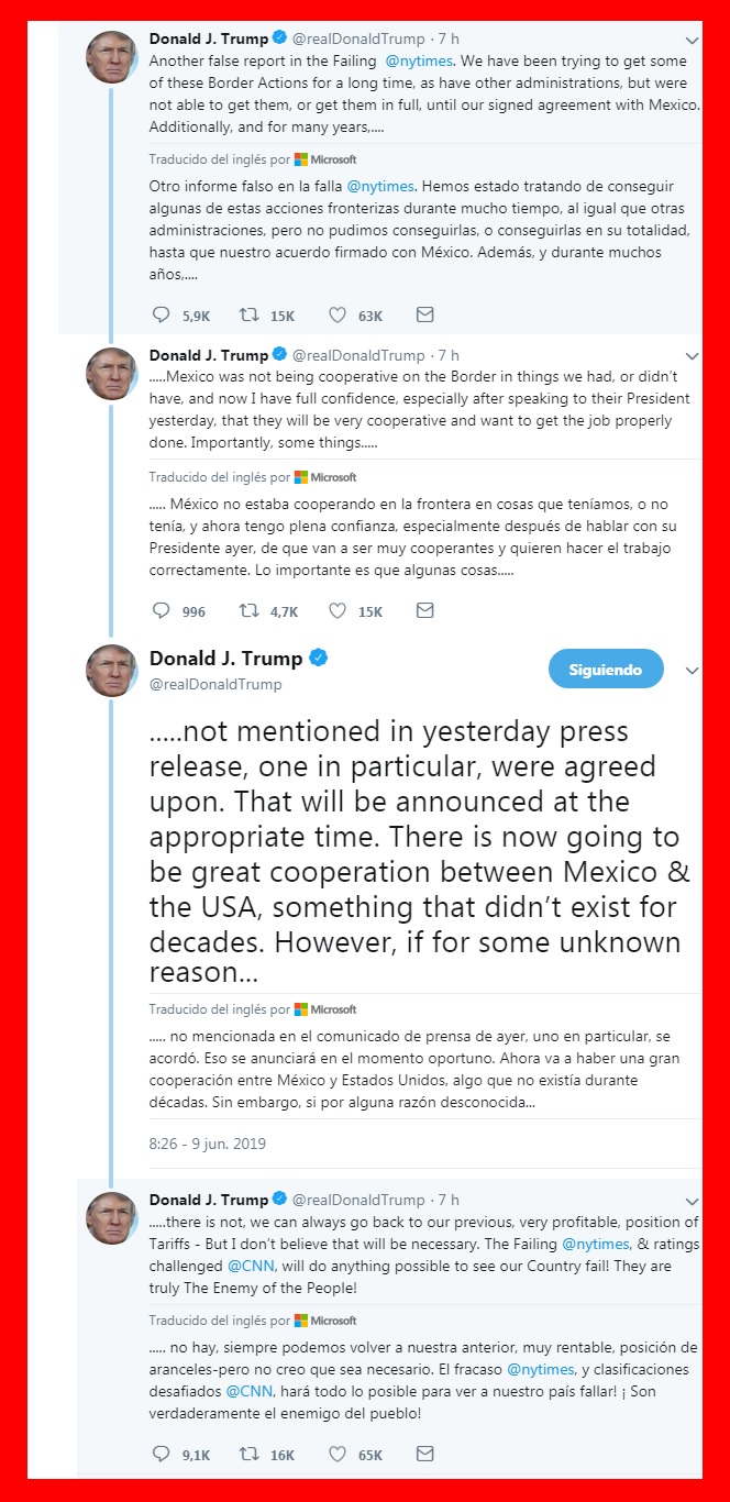 En una serie de tuits enviados antes de salir rumbo a club de golf en Virginia, el mandatario defendió el acuerdo para no concretar su amenaza de imponer aranceles del 5% a los productos mexicanos importados a partir del lunes, pero advirtió que “si por alguna razón desconocida” tal cooperación falla, “siempre podemos volver a nuestra posición anterior, muy rentable, de Tarifas”.
