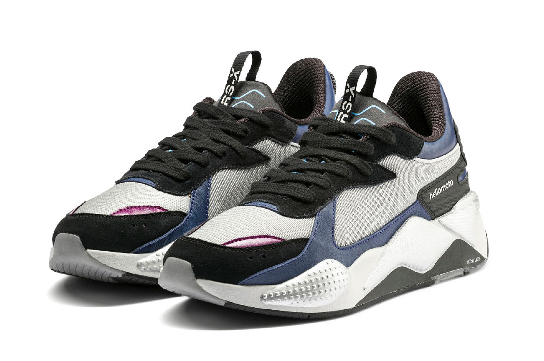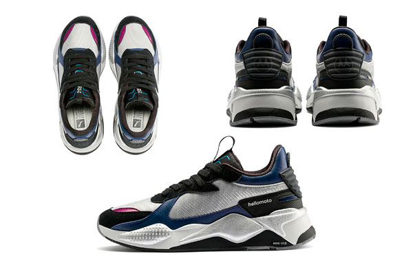 Las zapatillas/tenis RS-X Tech Motorola están inspiradas en los diseños de los teléfonos móviles de Motorola de los años 80, 90 y 2000. Cuentan con una textura en la suela exterior que recuerda al teclado del teléfono móvil, el distintivo «hellomoto» en el lateral y el logo de la “M” sutilmente colocado en la insignia del talón. Creadas para una nueva generación de personas dinámicas, estarán disponibles en los colores futuristas PUMA Silver y Sodalite Blue. Estas zapatillas/tenis forman parte de una línea de prendas que incluirán camisetas y shorts, con los colores típicos de Motorola en los años 80 y gráficos que representan diferentes hitos en la evolución de la comunicación, desde pagers a teléfonos con tapa y teclados QWERTY.