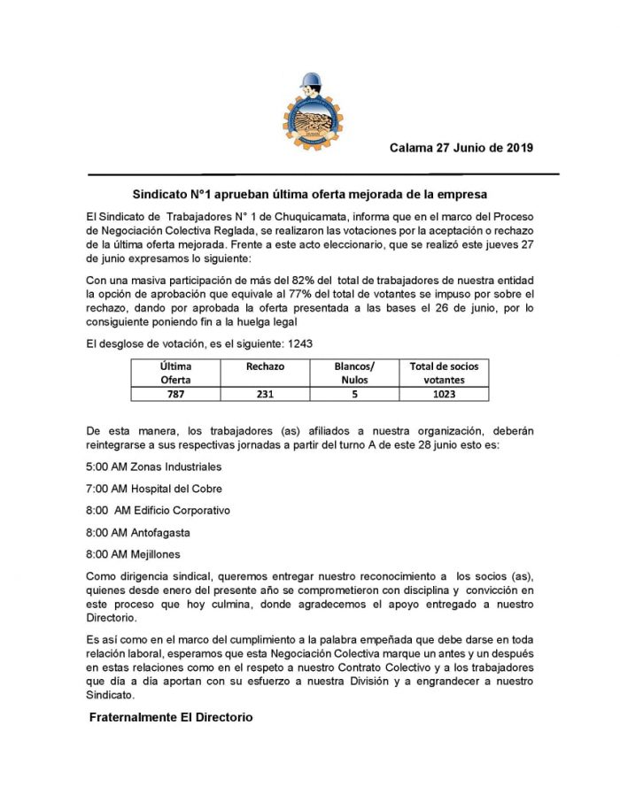 “Estos acuerdos reflejan el compromiso de cada una y cada uno de los trabajadores con este negocio que pertenece a todos los chilenos y que juntos debemos transformar para que siga siendo rentable y sustentable en el tiempo» señaló la cuprífera estatal.