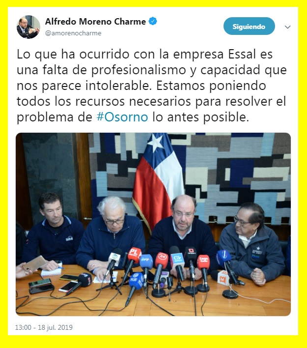 Las duras críticas de Moreno a ESSAL, quedaron como simples bravatas de barrio: “Lo que ha ocurrido con la empresa Essal es una falta de profesionalismo y capacidad que nos parece intolerable…”(Twitter, 18 de julio 13:00 horas)