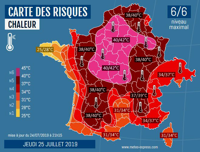 Tras vivir la noche más calurosa de su historia, Francia encabezó hoy de nuevo el ranking de temperaturas extremas y anotó los registros más altos hasta la fecha en diversas localidades del norte –42,6 grados en París, 41 en Reims y 40 en Lille– que obligaron a decretar la alerta roja en 20 departamentos. El anterior registro más alto en París fue el 28 de julio 1947, cuando el mercurio marcó 40,4 °C.
