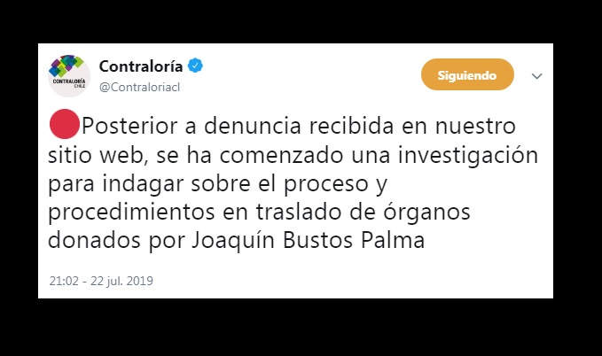 «Posterior a denuncia recibida en nuestro sitio web, se ha comenzado una investigación para indagar sobre el proceso y procedimientos en traslado de órganos donados por Joaquín Bustos Palma», señaló la Contraloría General de la República, que dirige el también ultracuestionado contralor Jorge Bermúdez, en su cuenta de Twitter.