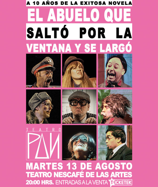 La función única que se realizará el martes 13 de agosto a las 20:00 horas en el Teatro Nescafé de las Artes también coincide con la celebración de los dieciocho años de la compañía TeatroPan, responsables de otros célebres montajes como “GALILEO, la tierra se detiene otra vez”, “Romeo y Julieta” y “Alicia en el espejo”. El elenco de “El abuelo que saltó por la ventana y se largó” incluye a Paulina Casas, Víctor Díaz, Jaime Reyes, Andrés Rillon, Renato Vázquez y Érico Vera. Las entradas están disponibles a través de Ticketek.