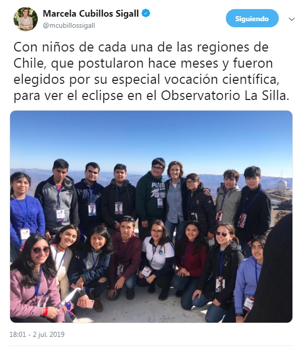 Malestar causó que la ministra Marcela Cubillos en medio de CRISIS POR PARO DOCENTE Ministra de Educación va a ver el ECLIPSE y no va sesión especial en el Senado.a La cuestionada secretaria de Estado salió a explicar -vía Twitter- la razón de su viaje: «Con niños de cada una de las regiones de Chile, que postularon hace meses y fueron elegidos por su especial vocación científica, para ver el eclipse en el Observatorio La Silla», señaló.