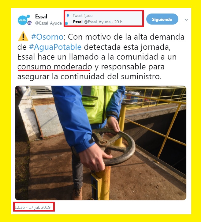 En tanto, hasta este jueves ESSAL mantiene como tuit fijado la siguiente información: «#Osorno: Con motivo de la alta demanda de #AguaPotable detectada esta jornada, Essal hace un llamado a la comunidad a un consumo moderado y responsable para asegurar la continuidad del suministro».