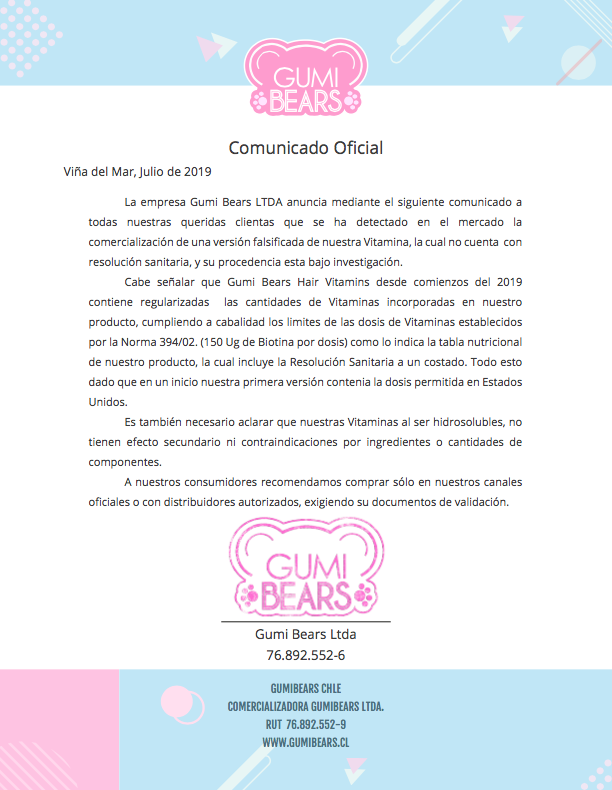 «Las Vitaminas Gumi Bears Hair ingresaron al país cumpliendo todas las normas de los países proveniente, pero en nuestro país esas normas debían cumplirse a través de otros límites porcentuales. Bajo esto es que información que el comunicado se desarrolló a raíz de que el porcentaje de Biotina excedía el límite establecido en Chile, por lo cual se realizó la formulación en enero del 2019 y actualmente en la información nutricional del producto se podrán visualizar la correcta información y composición de nuestra vitamina».