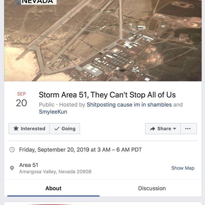 En cuestión de días, 900,000 personas han confirmado su participación en el evento “Storm Área 51” que invita, literalmente, a marchar al Área 51 para “ver a los aliens” y descubrir la verdad. El evento dice que no los pueden detener a todos, así que a las 3 de la tarde del 20 de septiembre de 2019, los confirmados se van a dirigir a Nevada y se van a reunir cerca de la base de la Fuerza Aérea y van a correr hacia las instalaciones restringidas para llegar al fondo del misterio.