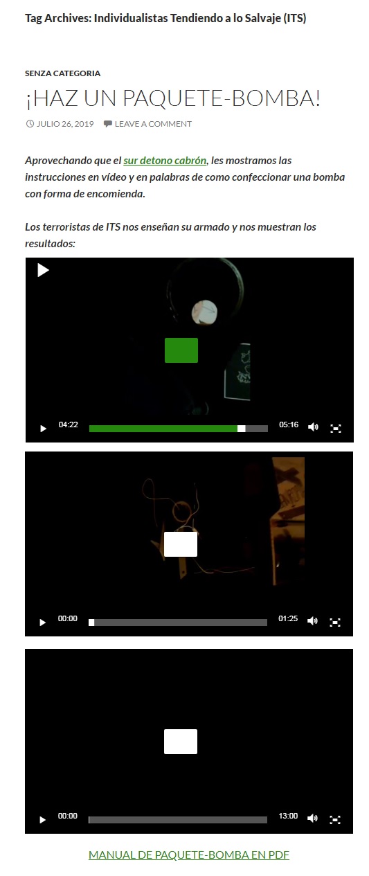 «¡HAZ UN PAQUETE-BOMBA!, JULIO 26, 2019; Aprovechando que el sur detono cabrón, les mostramos las instrucciones en vídeo y en palabras de como confeccionar una bomba con forma de encomienda. Los terroristas de ITS nos enseñan su armado y nos muestran los resultados», publica en su sitio el grupo eco terrorista Individualistas Tendiendo a lo Salvaje (ITS).
