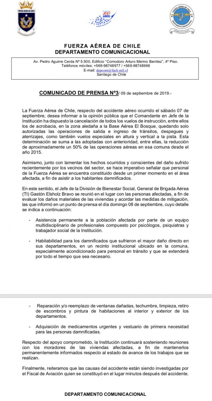 Tras la caída del avión de entrenamiento ocurrido el sábado en la Villa Tattersal, cercana a la BAse Aérea El Bosque de la Fuerza Aérea de Chile, y ante la presión pública para que la institución cese sus vuelos sobre la zona poblada, la institución, por orden del comandante en jefe Arturo Merino, anunció el fin e estos vuelos de instrucción, así lo anunció en un comunicado oficial: