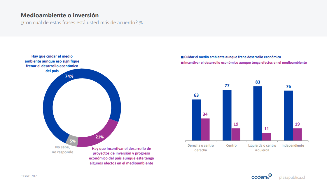 Ad portas de la COP 25 que se realizará en diciembre próximo, el sondeo contiene un especial sobre el medioambiente y muestra que el tema es importante para la ciudadanía, puesto que un 74% cree que es necesario cuidarlo aunque eso signifique frenar el desarrollo del país, mientras que un 21% estima que hay que incentivar el desarrollo de proyectos de inversión y progreso económico del país aunque este tenga efectos en el medioambiente.