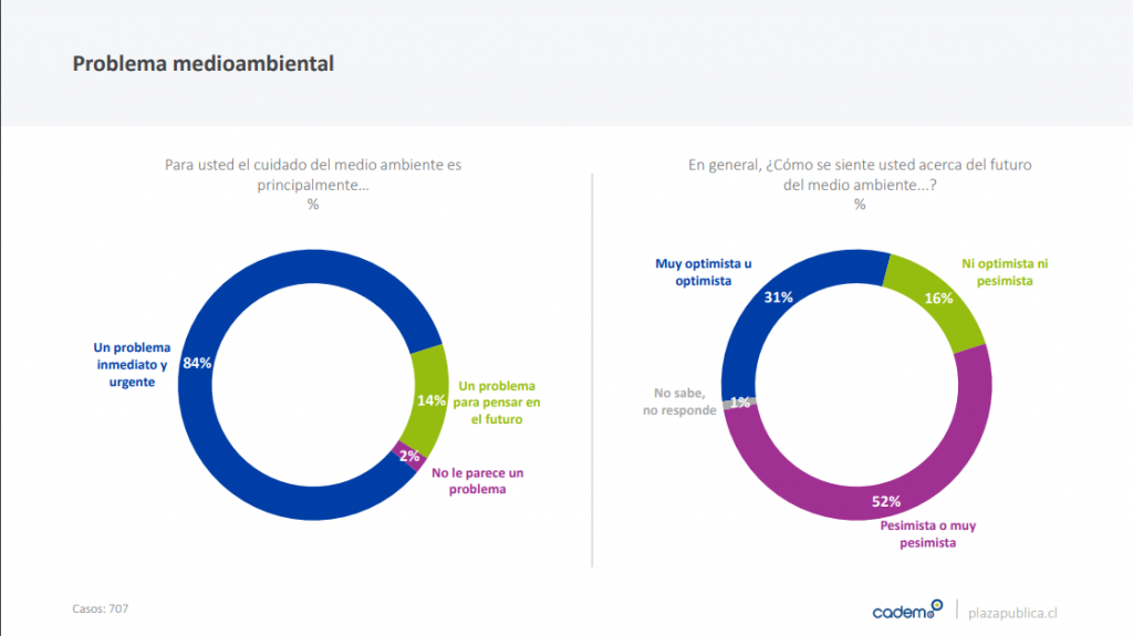 Además, un 84% de los entrevistados indica que el cuidado del medioambiente es un problema inmediato y urgente, mientras que un 14% cree que es un problema para pensar en el futuro.