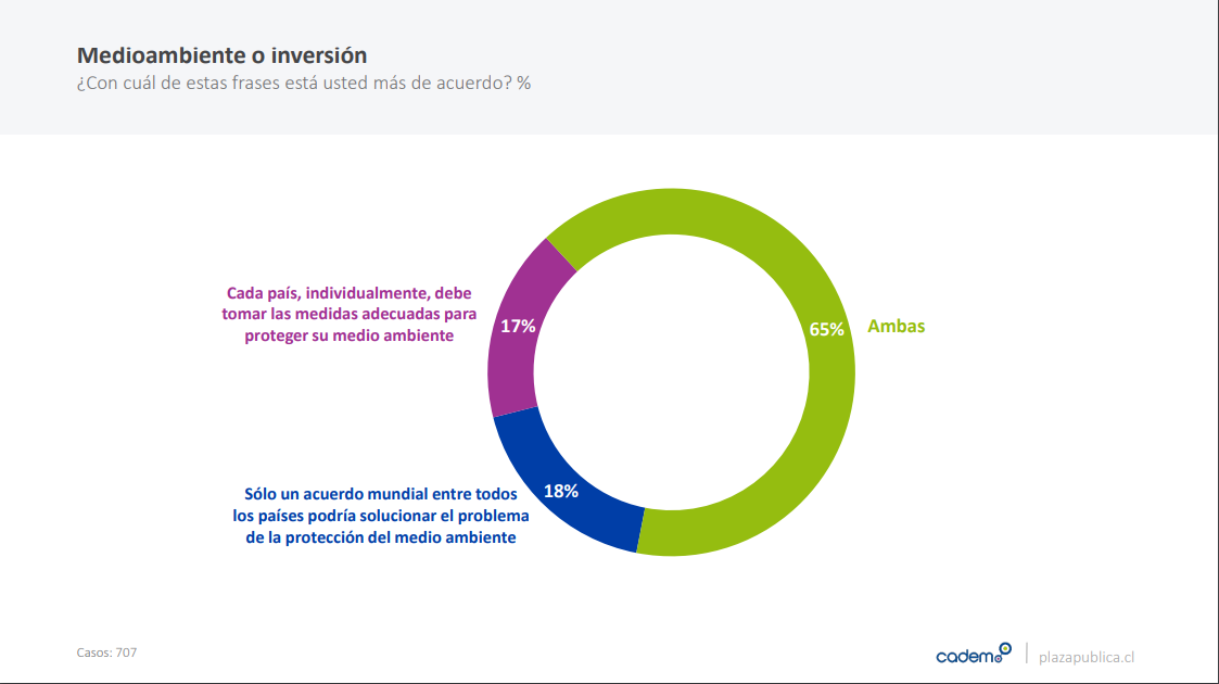 La Cadem también muestra que un 65% está por que cada país deba tomar las medidas adecuadas para proteger su medio ambiente y que un acuerdo mundial entre todas las naciones podría solucionar el problema de la protección ambiental.