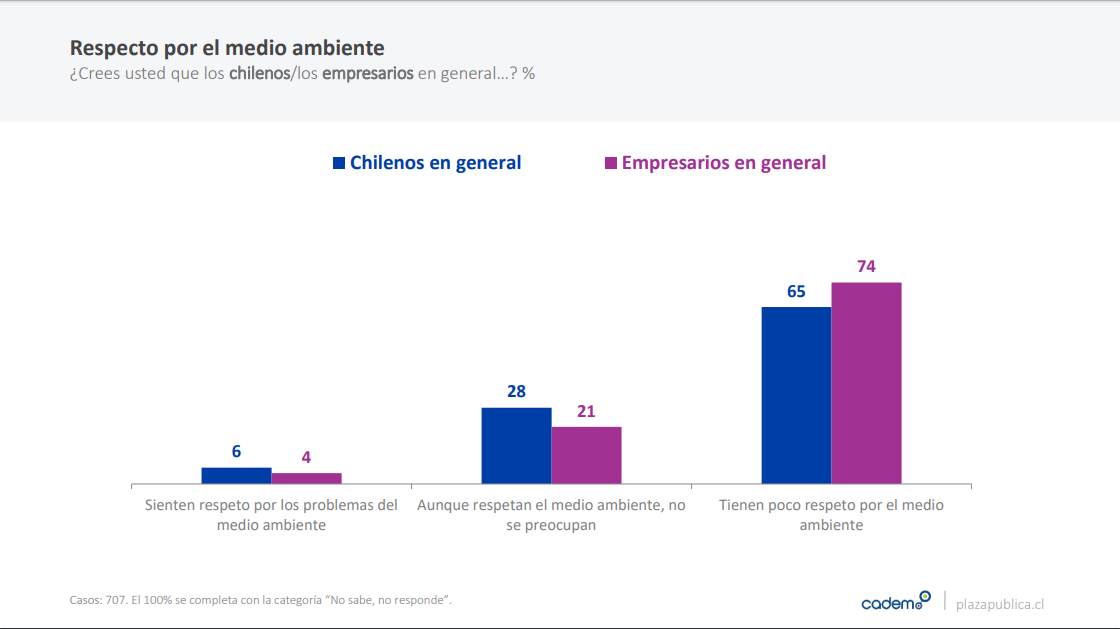 Sin embargo, un 74% de los chilenos estima que los empresarios tienen poco respeto por medioambiente y un 65% estima que son todos los chilenos. En cuanto a la posición de que aunque se respeta el medio ambiente no se preocupan, un 28% apunta a todos los chilenos y un 21% a los empresarios.