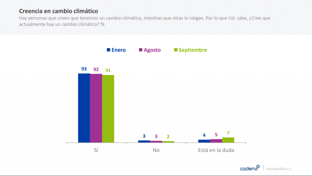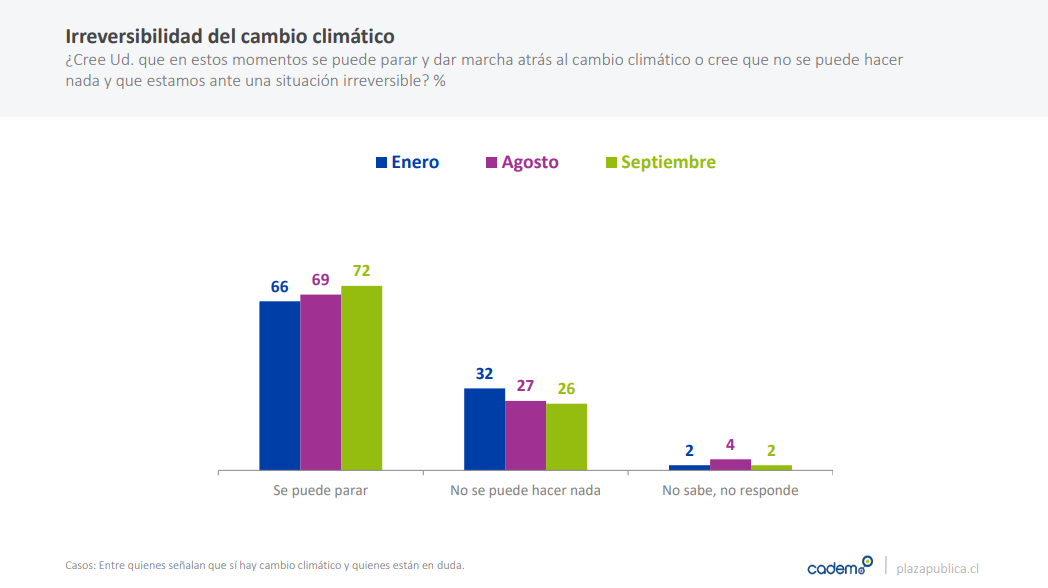 Ante la pregunta sobre la irreversibilidad del cambio climático, un 72% estima que se puede cambiar la situación, lo cual son tres puntos porcentuales más que en agosto pasado cuando marcó un 69%.