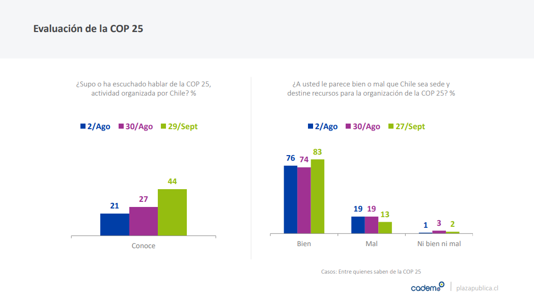 Sobre la COP25, el estudio menciona que un 44% de los encuestados dice saber o haber escuchado hablar de esta actividad que será organizada por Chile y un 83% señala estar de acuerdo en que el país sea sede del evento y se destinen recursos para su organización.