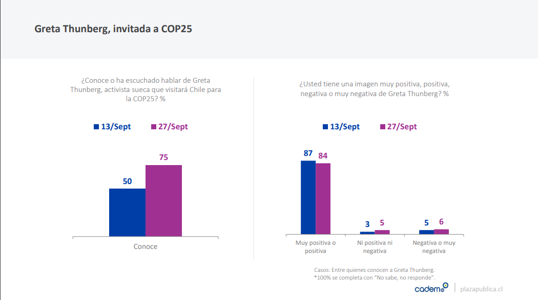 Un punto especial tiene la joven activista Greta Thunberg, ya que su conocimiento aumenta 25pts y llega al 75%, mientras que un 84% tiene una imagen positiva de ella.